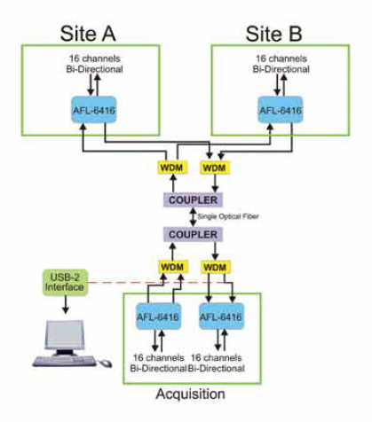 AFL-6400 可配置為遠程數據采集係統,在 PC 站點上使用 USB2 接口,在遠程站點上(shàng)使用 AFL-6400。兩個站點之間的距(jù)離可能長達 50 公裏。該